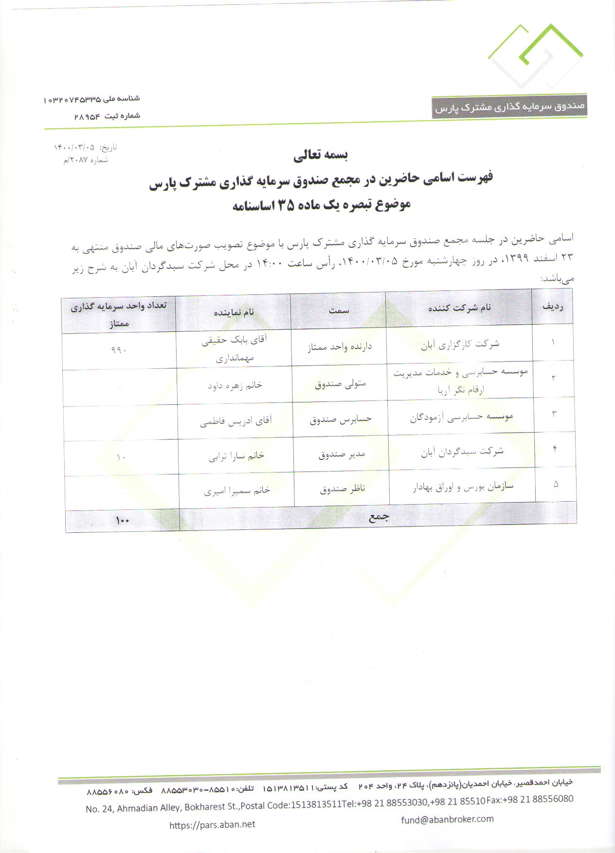 فهرست اسامی حاضر در مجمع مورخ 1400/03/05 مربوط به تصویب صورتهای مالی منتهی به 23 اسفند 1399