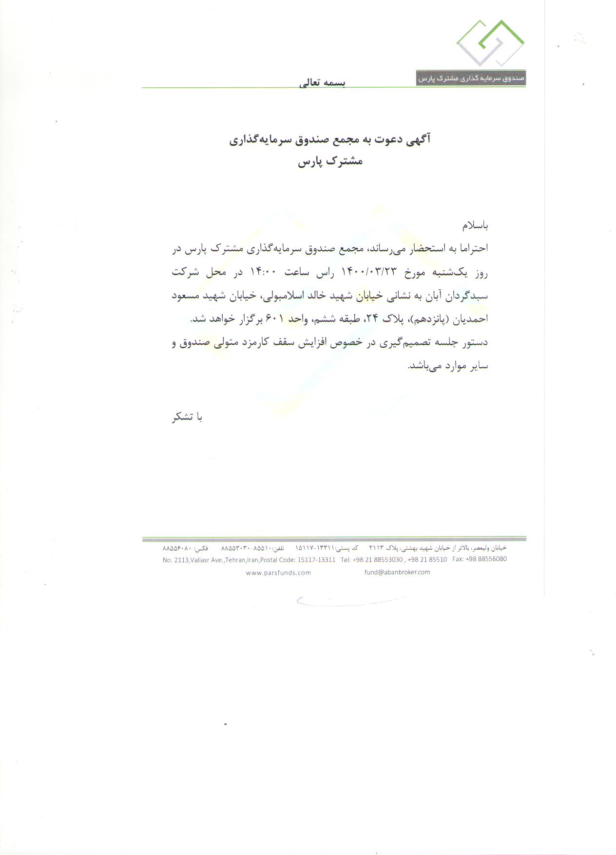 آگهی دعوت به مجمع با موضوع افزایش سقف کارمزد متولی صندوق و سایر موارد مورخ 1400/03/23