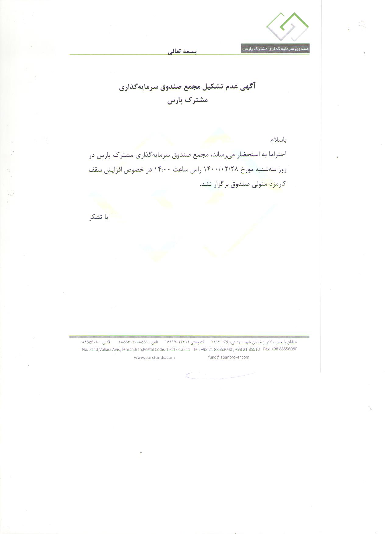 لغو آگهی مجمع با موضوع افزایش سقف کارمزد متولی صندوق و سایر موارد مورخ 1400/02/28
