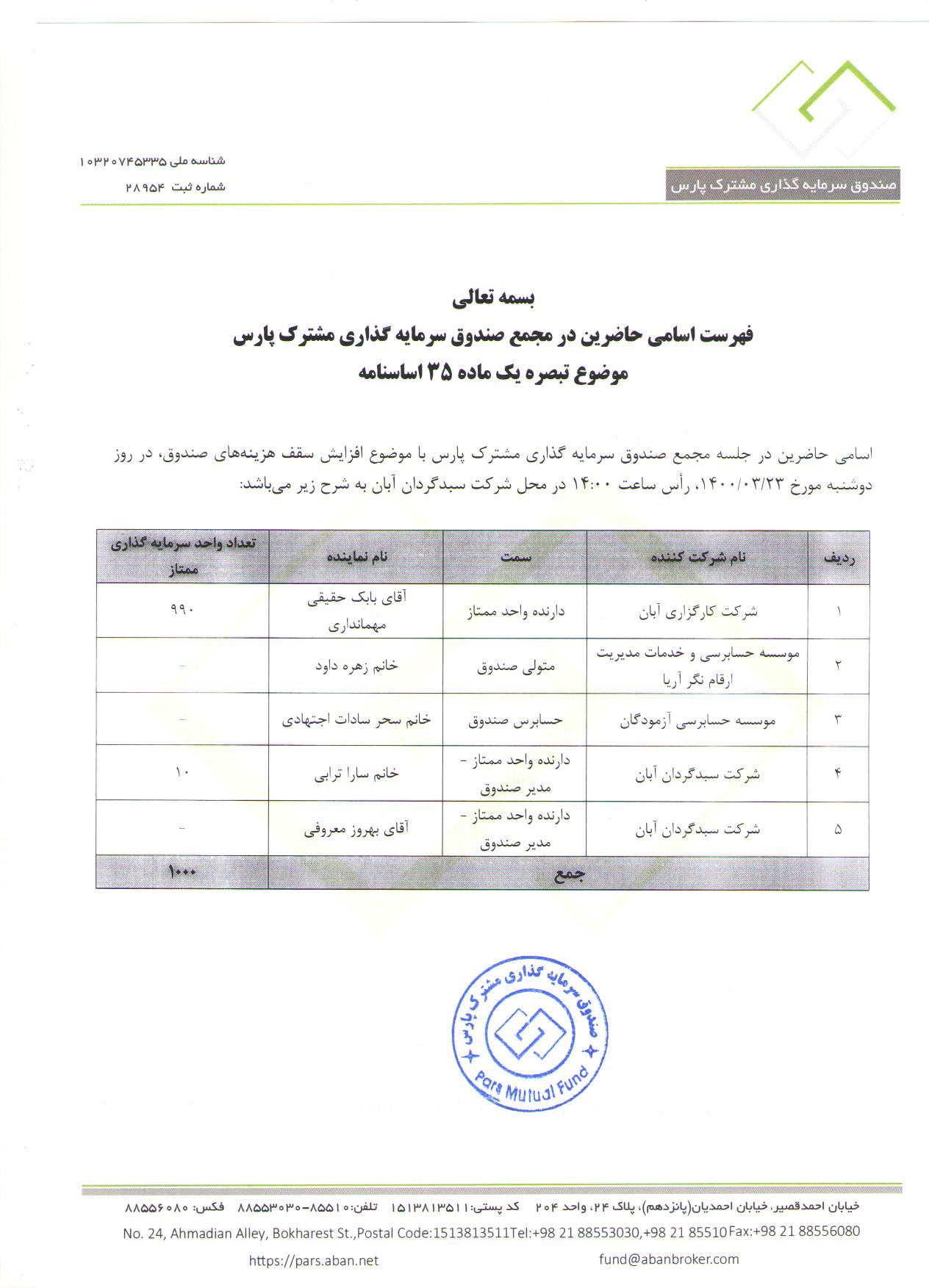 اسامی حاضرین در مجمع با موضوع افزایش سقف کارمزد متولی صندوق و سایر موارد مورخ 1400/03/23