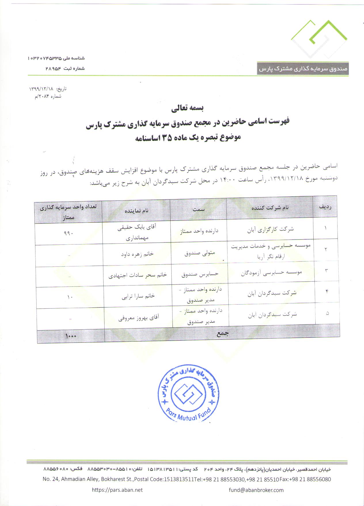 فهرست اسامی حاضر در مجمع مورخ 1399/12/25 مربوط به تغییر محل اقامت صندوق