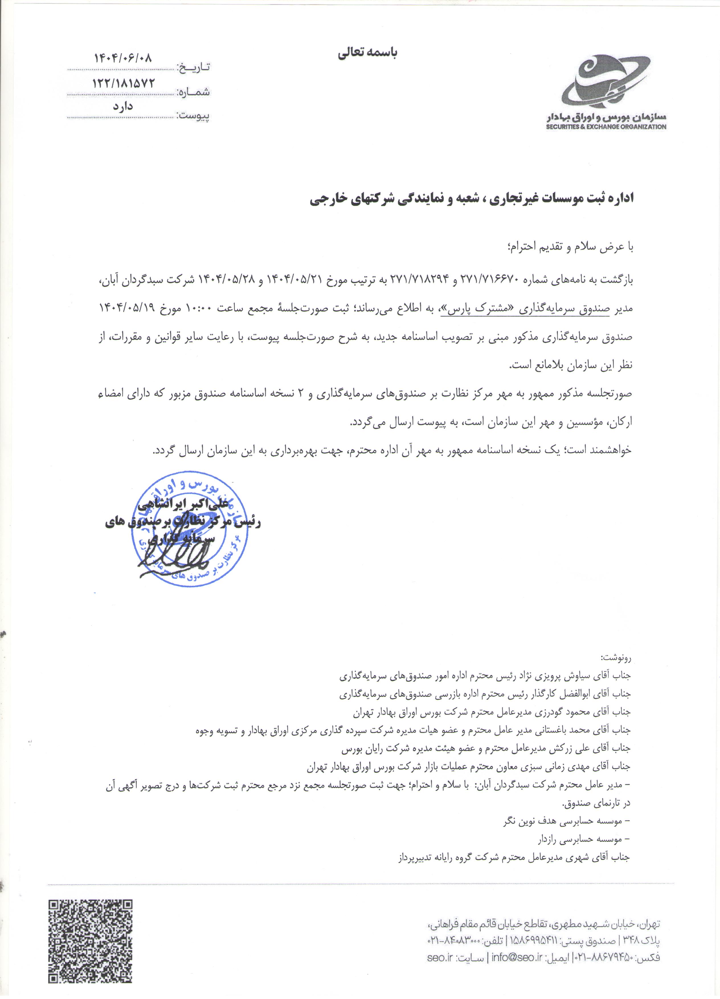 تاییدیه مجمع صندوق سرمایه گذاری مشترک پارس با موضوع تغییر اساسنامه مورخ ۱۴۰۴/۰۵/۱۹ ساعت 10:۰۰