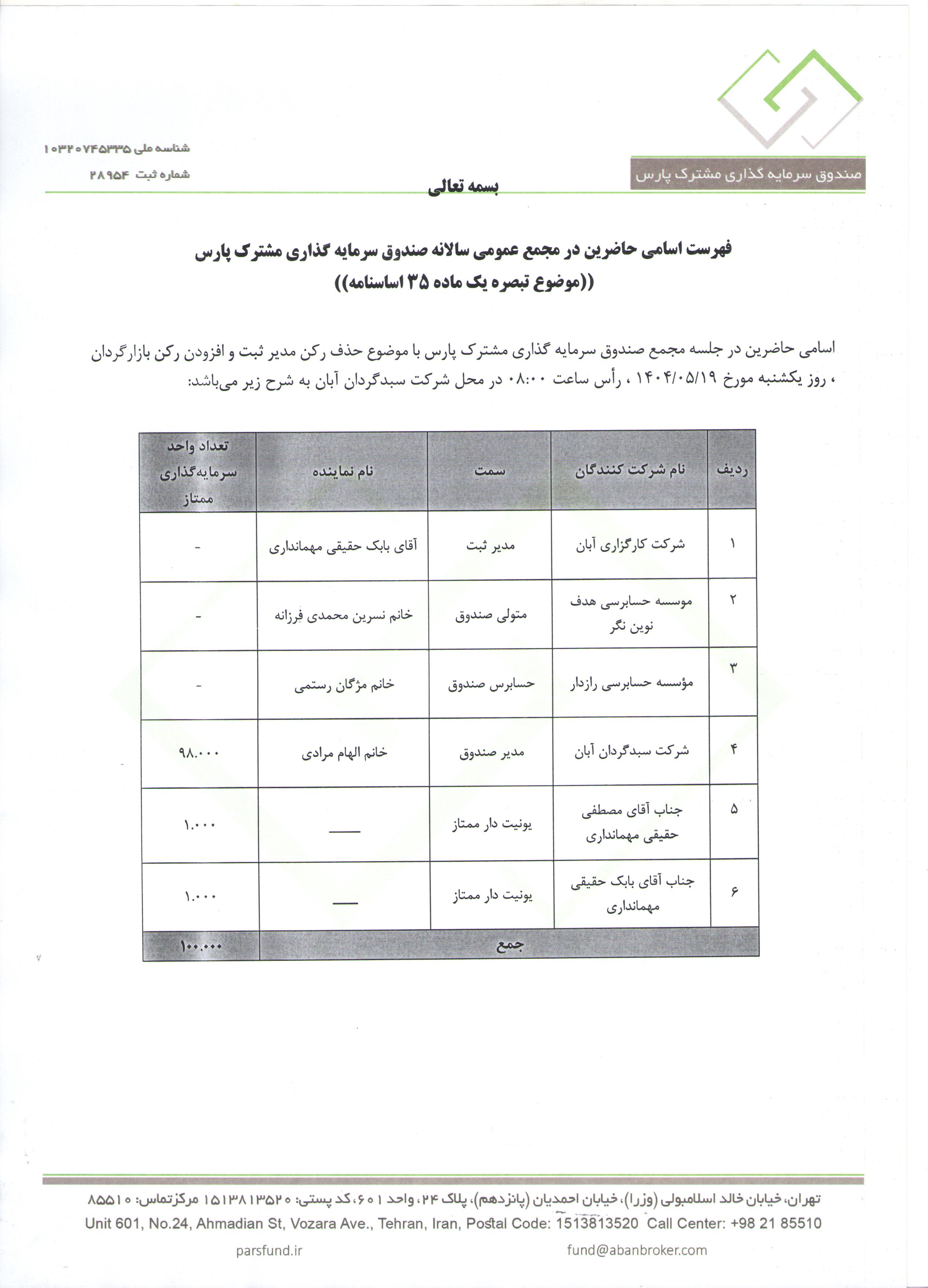 اسامی حاضرین به مجمع صندوق سرمایه گذاری مشترک پارس با موضوع اصلاح ماده 5 اساسنامه و نامحدود کردن مدت فعالیت صندوق مورخ ۱۴۰۴/۰۵/۱۹ ساعت 09:00