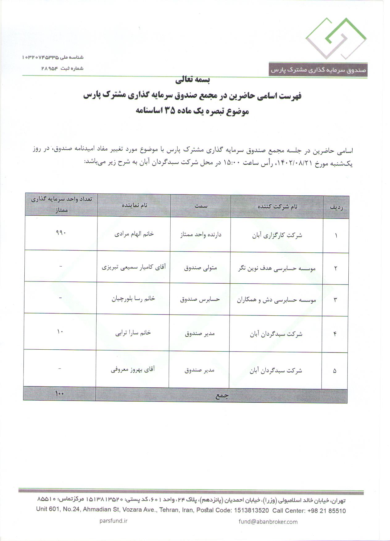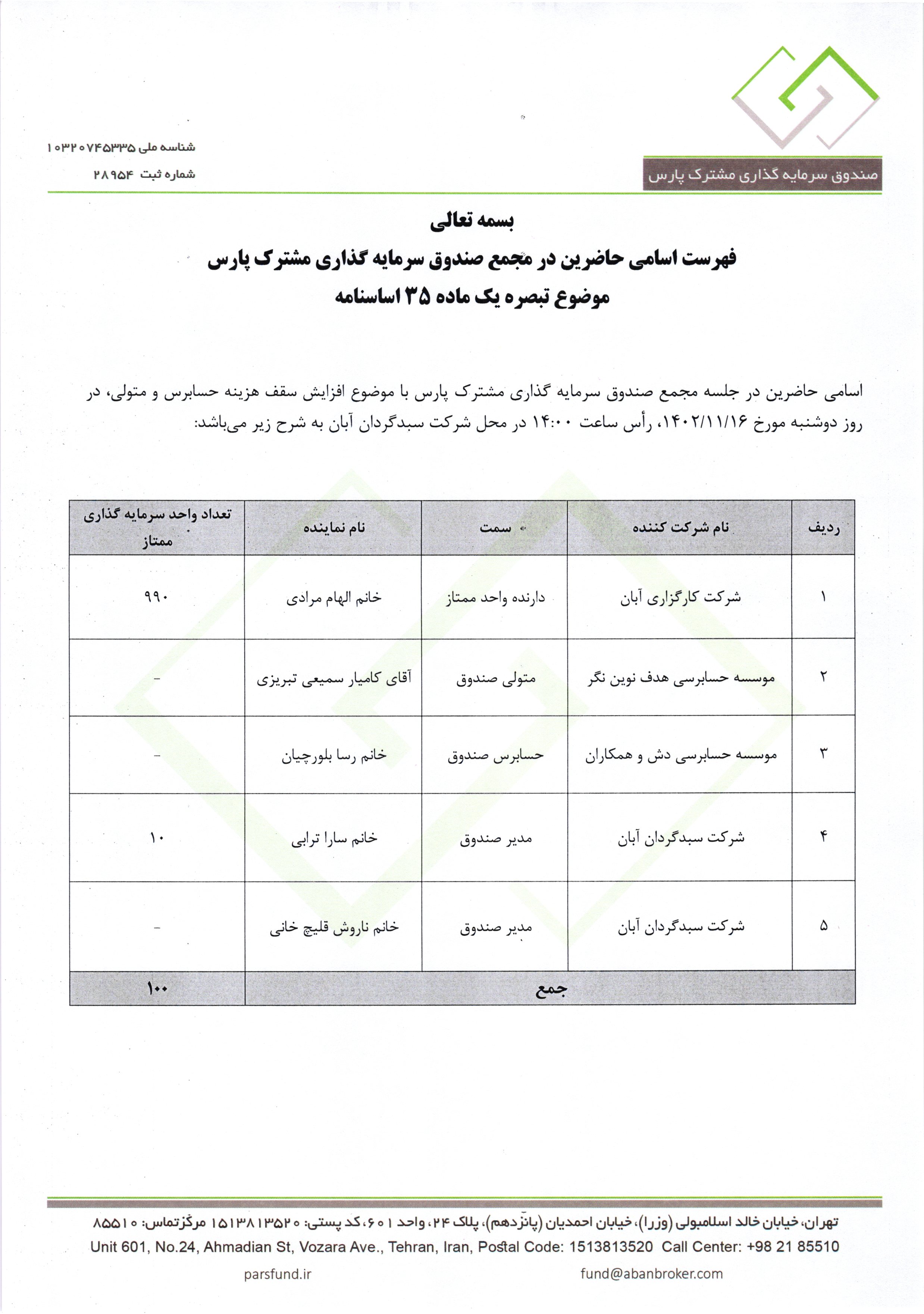 اسامی حاضرین در مجمع با موضوع افزایش هزینه حسابرس و متولی و سایر موارد مورخ 1402/11/16 ساعت 14:00 صندوق مشترک پارس