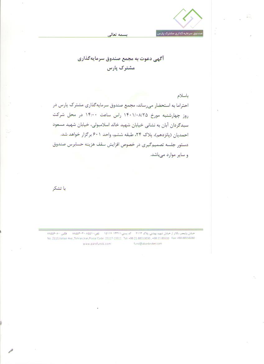 آگهی دعوت به مجمع با موضوع افزایش سقف هزینه حسابرس صندوق و سایر موارد مورخ 1401/08/25