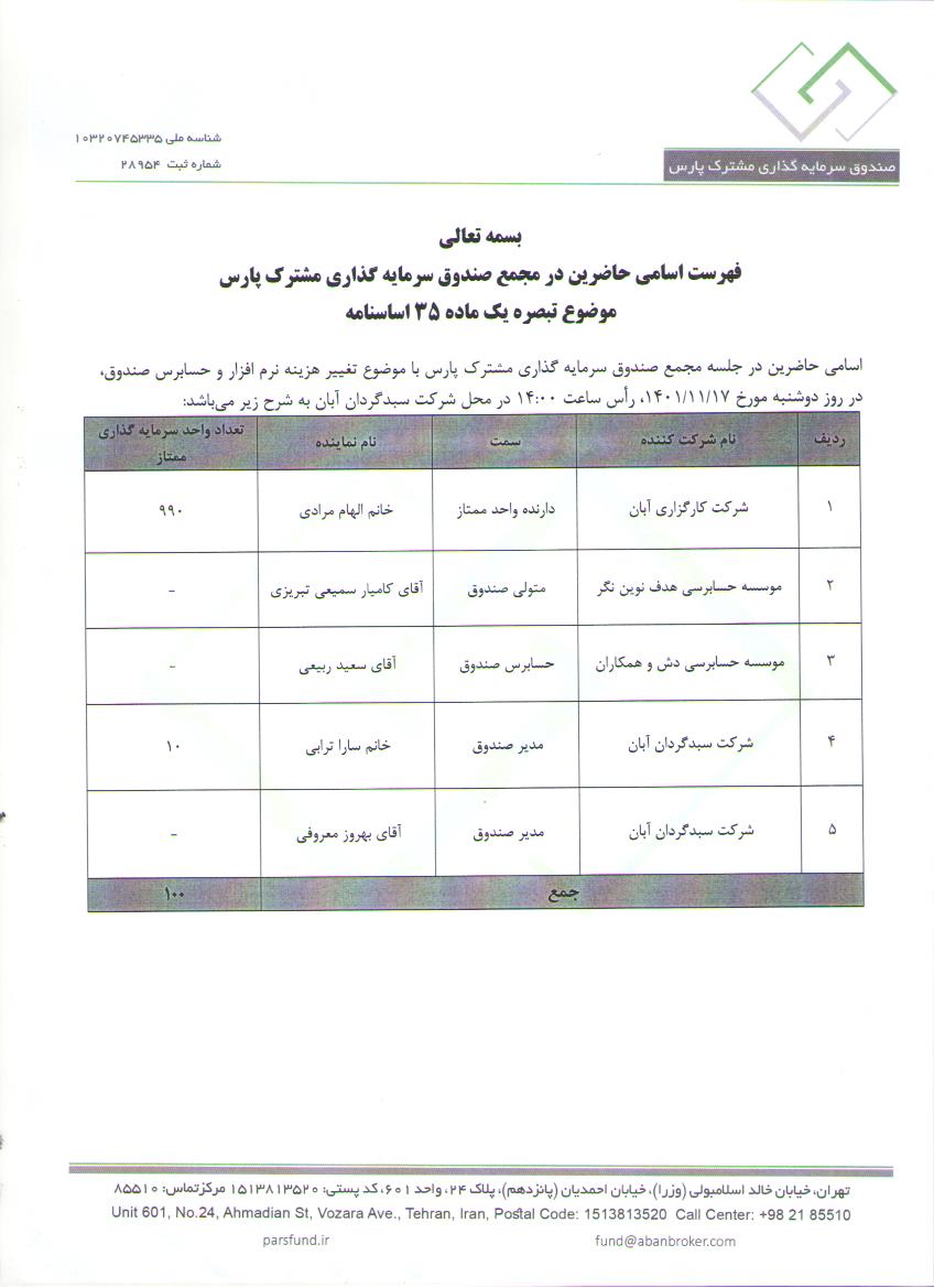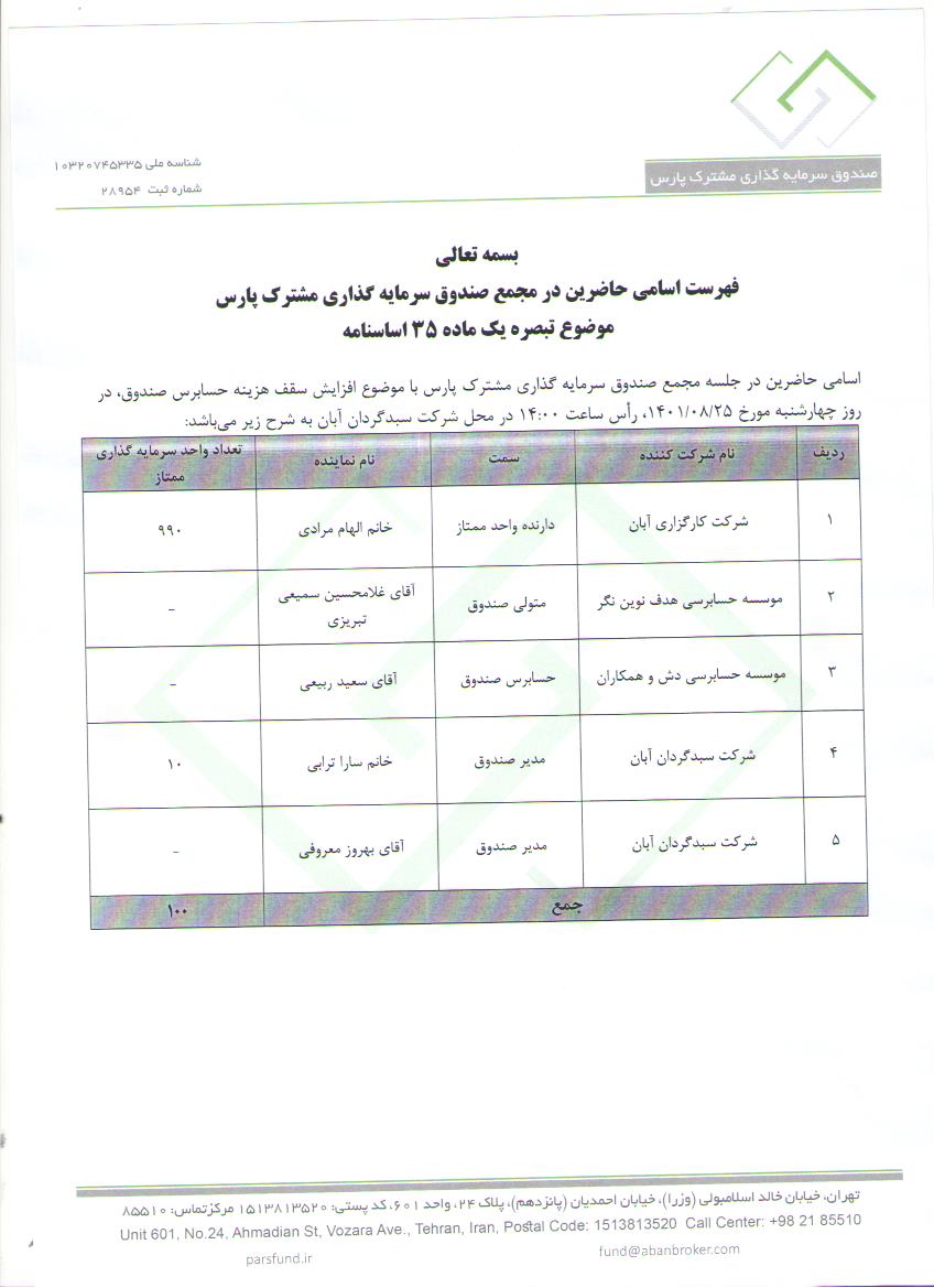 اسامی حاضرین در مجمع با موضوع افزایش سقف هزینه حسابرس صندوق و سایر موارد مورخ 1401/08/25