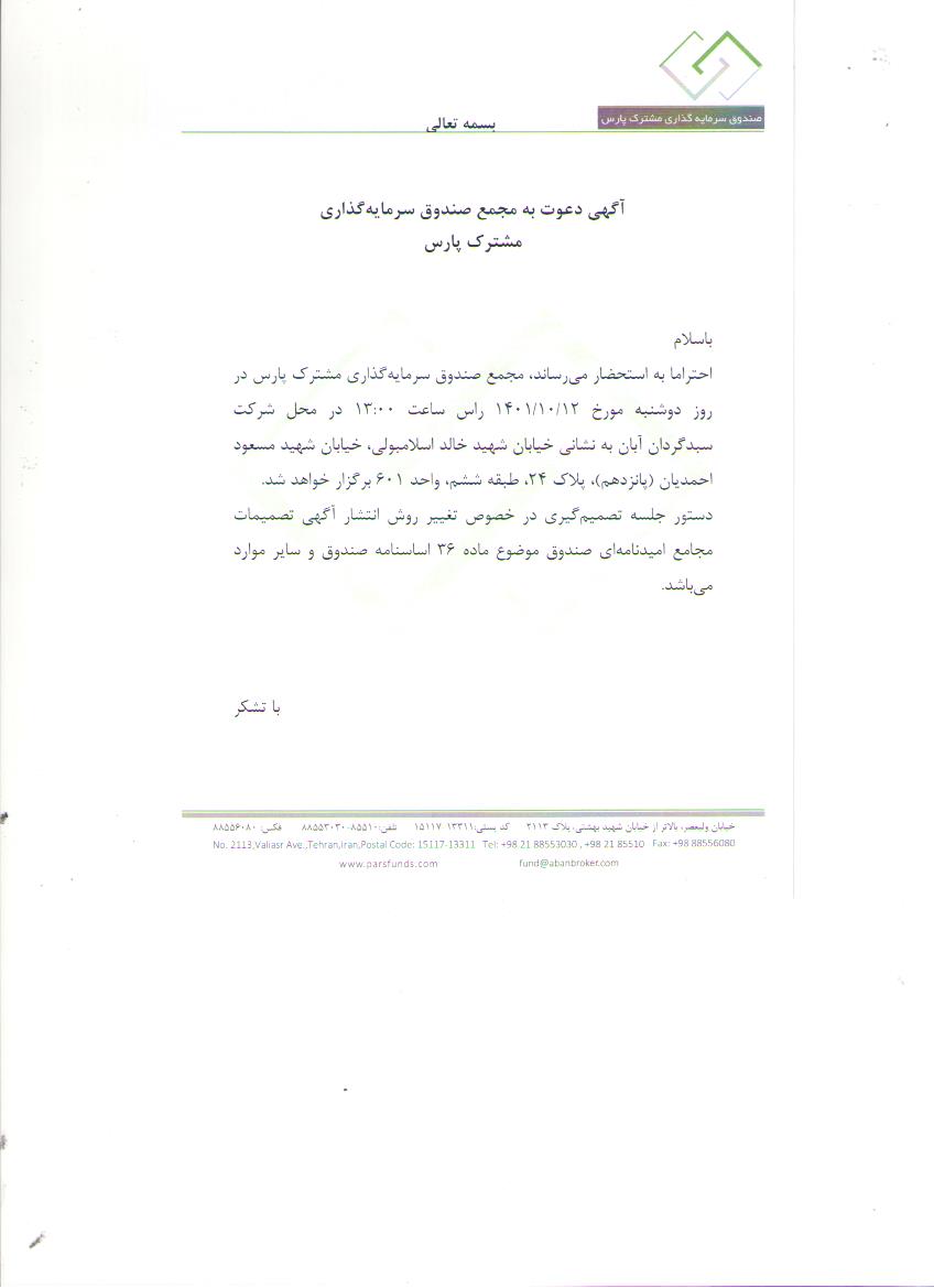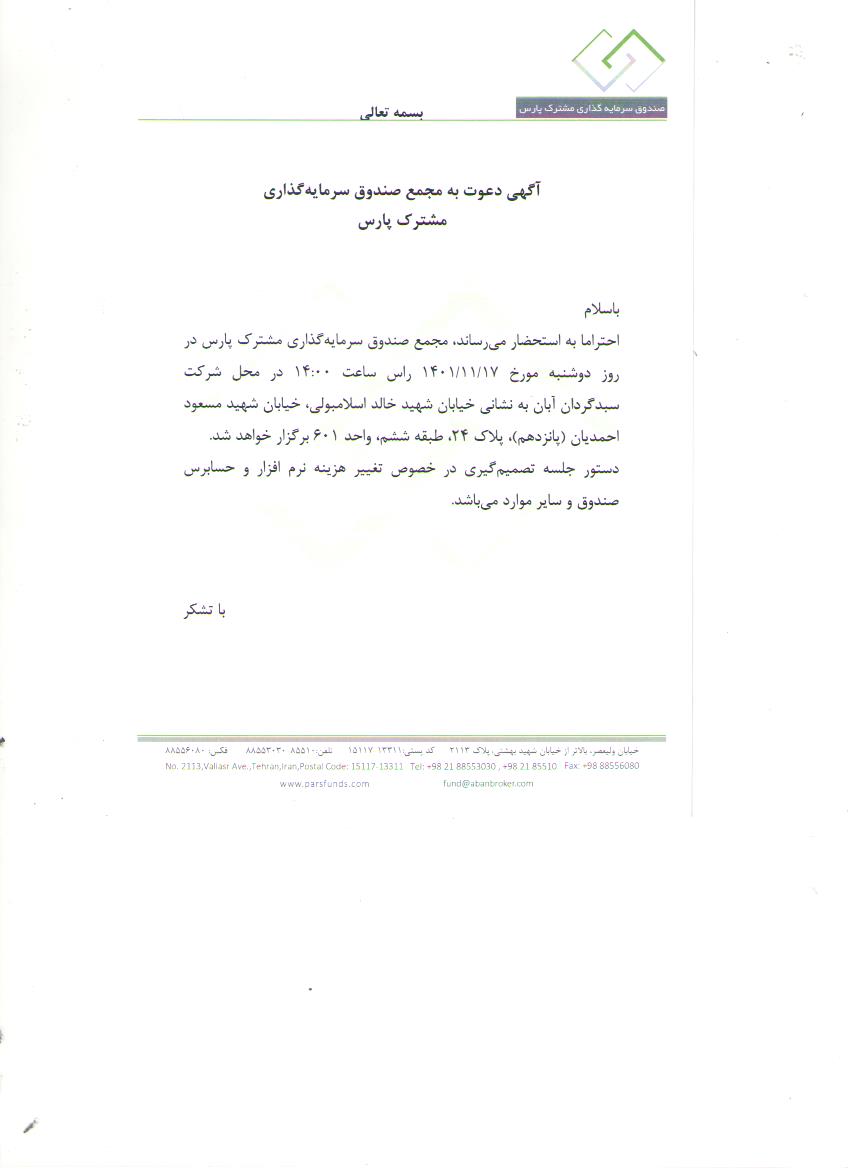 آگهی دعوت به مجمع با موضوع افزایش سقف هزینه حسابرس و نرم افزار صندوق و سایر موارد مورخ 1401/11/17